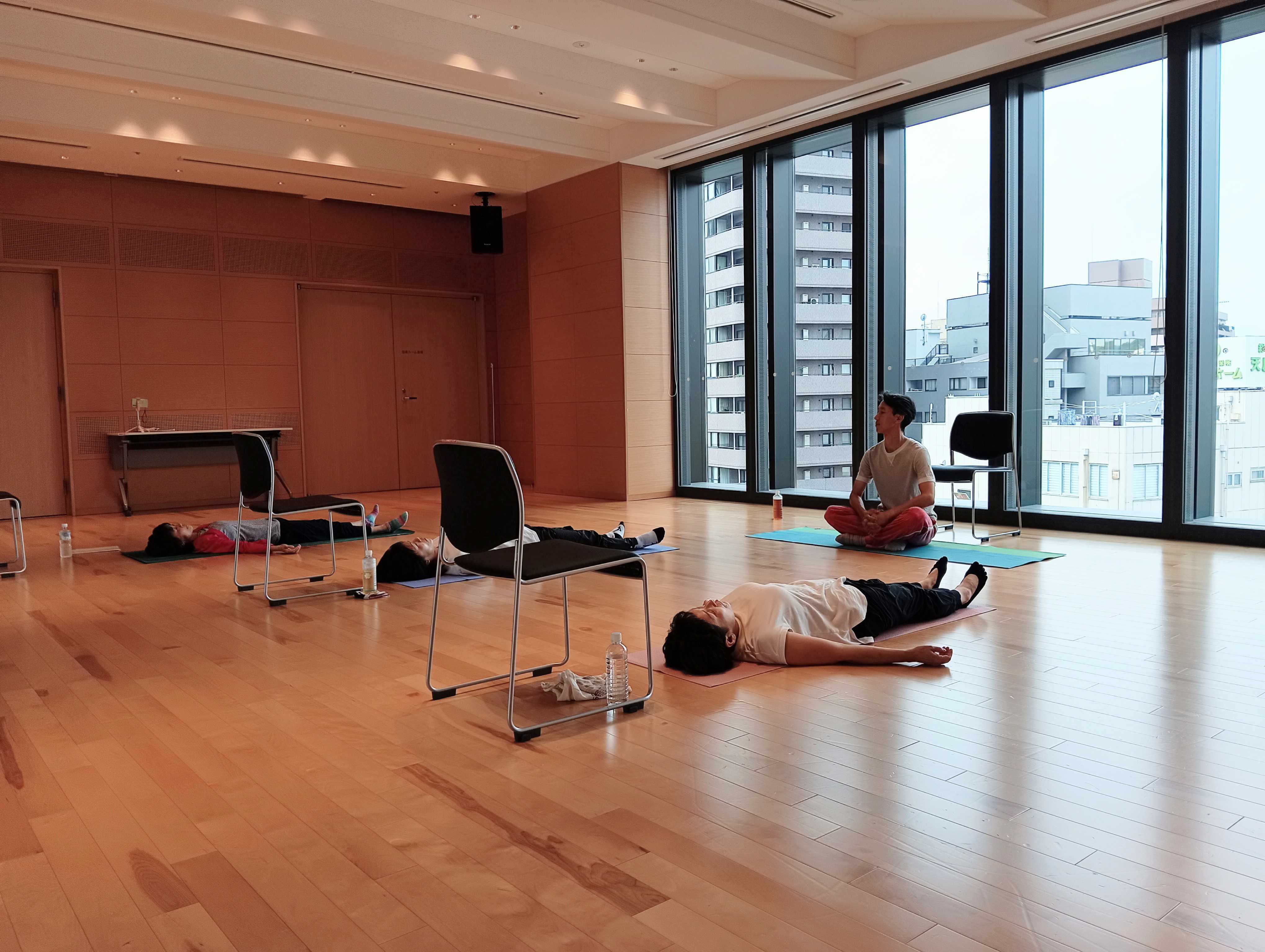 そのまま呼吸と身体の一体化を練習し、「息が入る/吐ける」感覚を整えます。